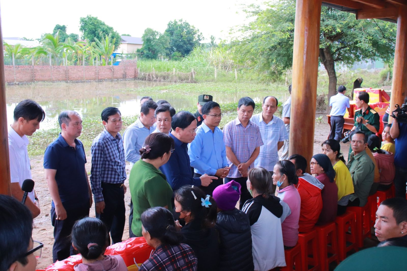 Đồng chí Phạm Anh Tuấn - Phó Bí thư Tỉnh uỷ, Chủ tịch UBND tỉnh (áo xanh đậm, đứng thứ 3 từ phải qua) thăm hỏi, động viên bà con nhân dân của xã bị thiệt hại trong đợt ngập lụt vừa qua.