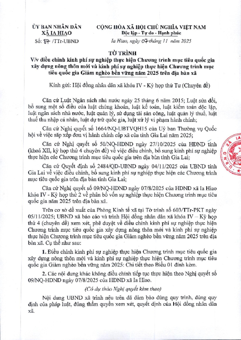 | Tiêu đề văn bản | TỜ TRÌNH V/V ĐIỀU CHỈNH KINH PHÍ SỰ NGHIỆP THỰC HIỆN CHƯƠNG TRÌNH MỤC TIÊU QUỐC GIA XÂY DỰNG NÔNG THÔN MỚI VÀ KINH PHÍ SỰ NGHIỆP THỰC HIỆN CHƯƠNG TRÌNH MỤC TIÊU QUỐC GIA GIẢM NGHÈO BỀN VỮNG NĂM 2025 TRÊN ĐỊA BÀN XÃ | ||