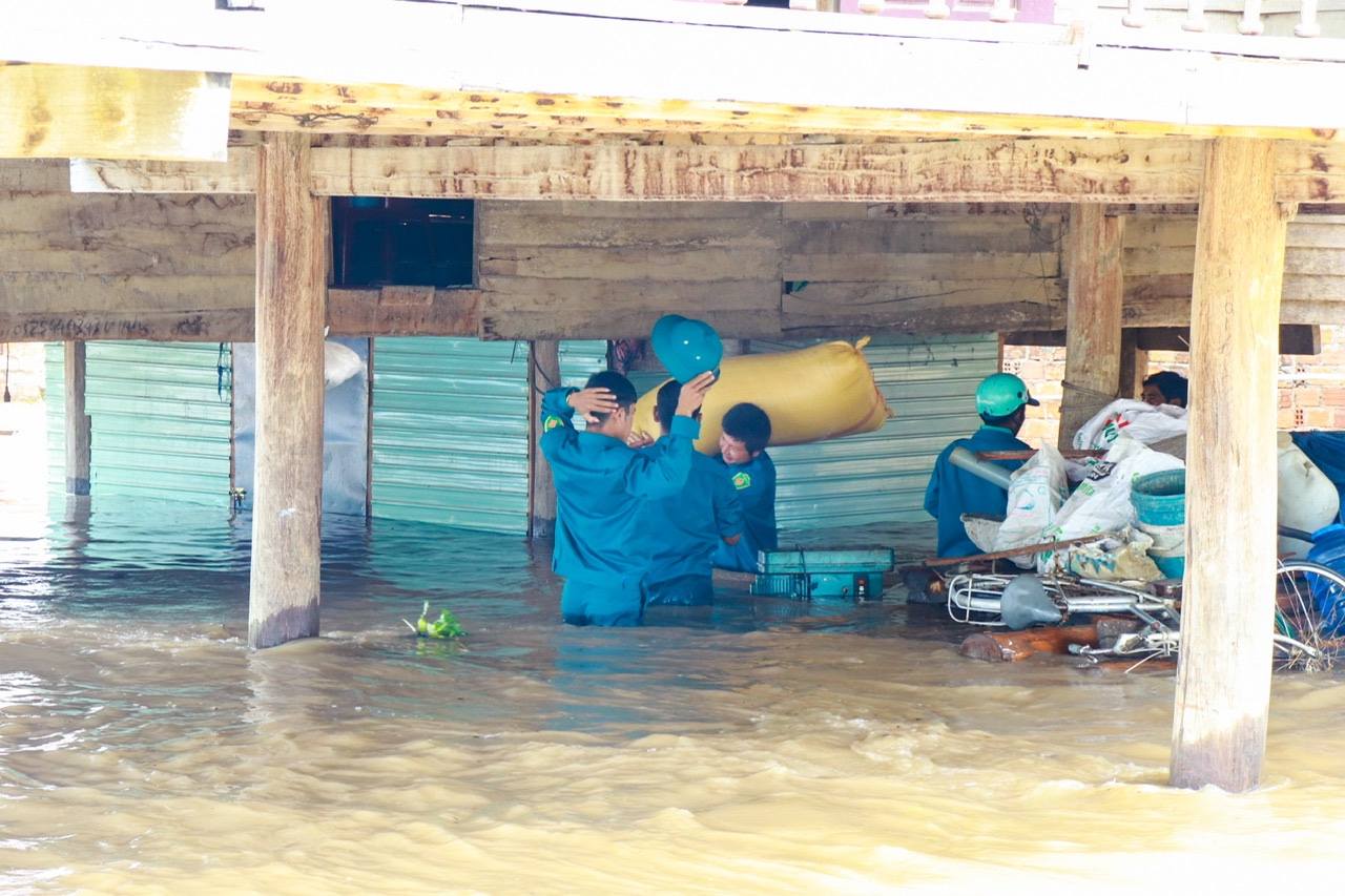 Lực lượng dân quân cơ động tích cực hỗ trợ bà con vận chuyển vật dụng đến nơi đảm bảo an toàn.