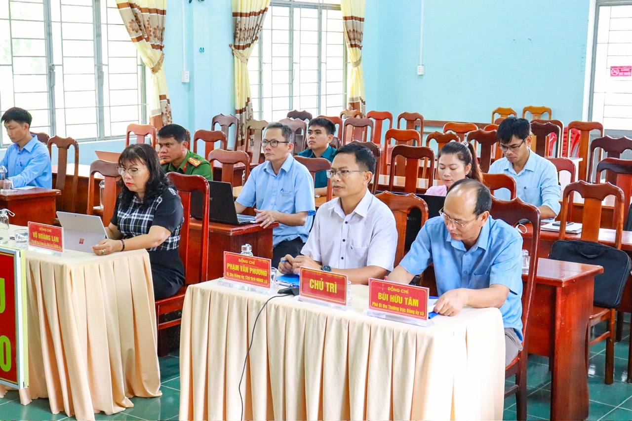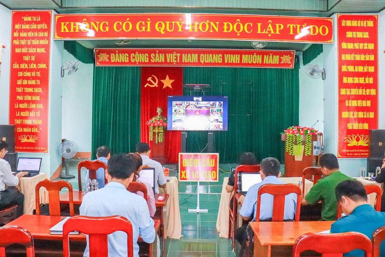 Các đồng chí trong Thường trực Đảng ủy xã (hàng đầu tiên) chủ trì điểm cầu tại xã Ia Hiao.